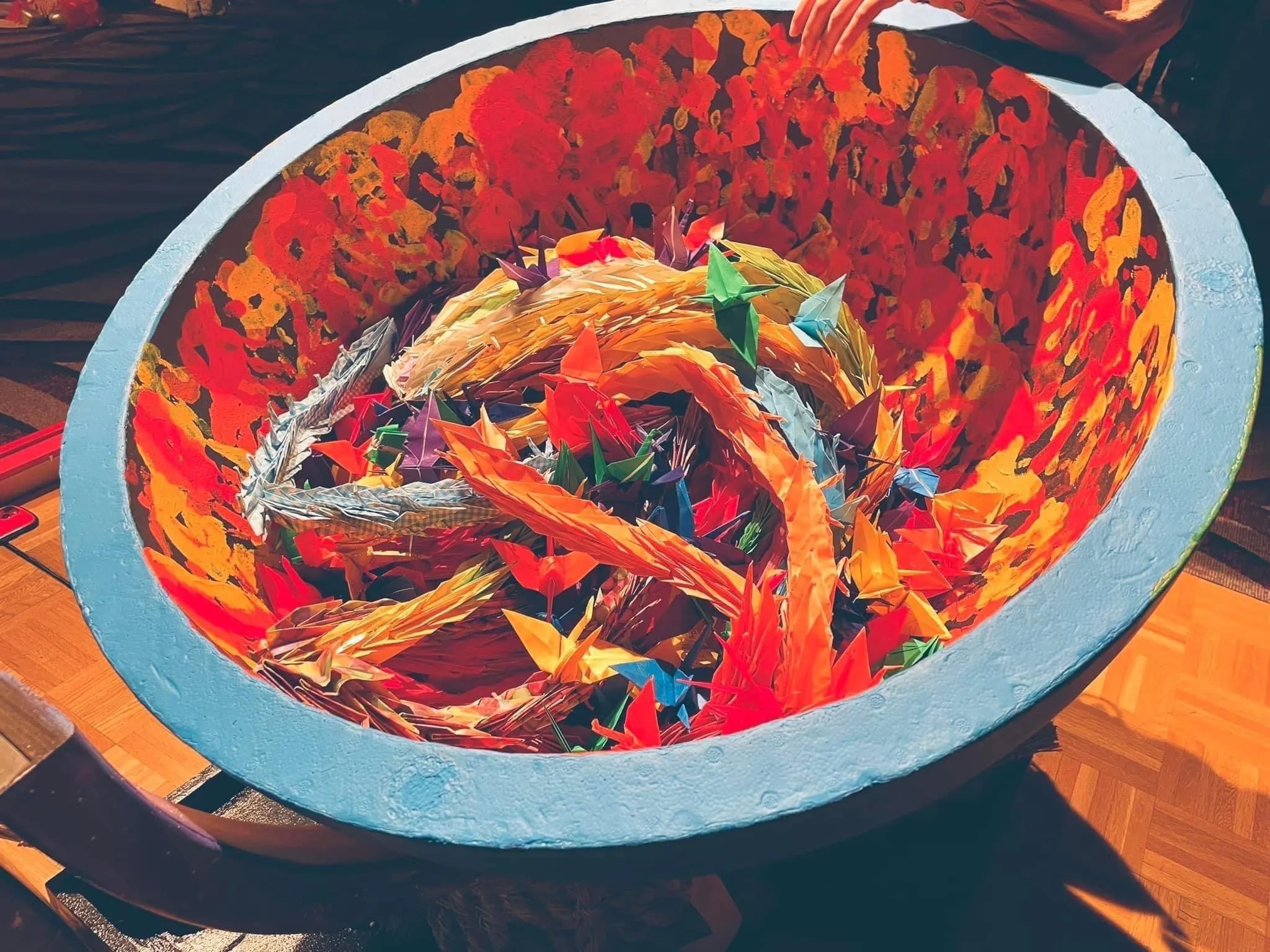 一人ひとりの夢が書かれた折り鶴。旅で出会った夢も折り鶴にしています