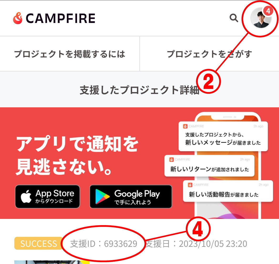 ②画面右上の丸いアイコン > 支援したプロジェクト