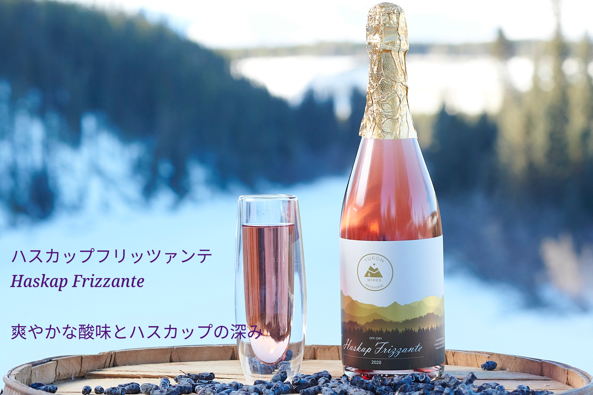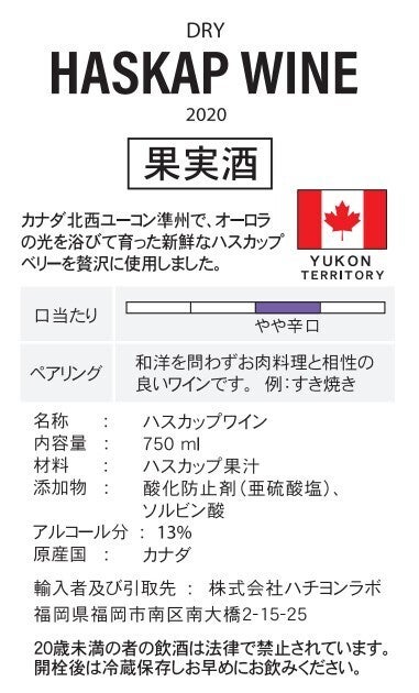 ハスカップ果汁100%使用!!なんと2023年Canadian All Wine Championshipsのフルーツワイン部門で一番ダブルゴールドを受賞いたしました!!深紅色の美しい色合いが特徴で、酸味と甘みがバランス良く調和された味わいがあります。口の中で転がすとハスカップに加え、さくらんぼやスミレのようなアロマが立ち上ります。肉料理や魚料理、野菜の炒め物など、どんな料理とも相性の良いワインに仕上がっております。しっかり冷やしてお召し上がりください。