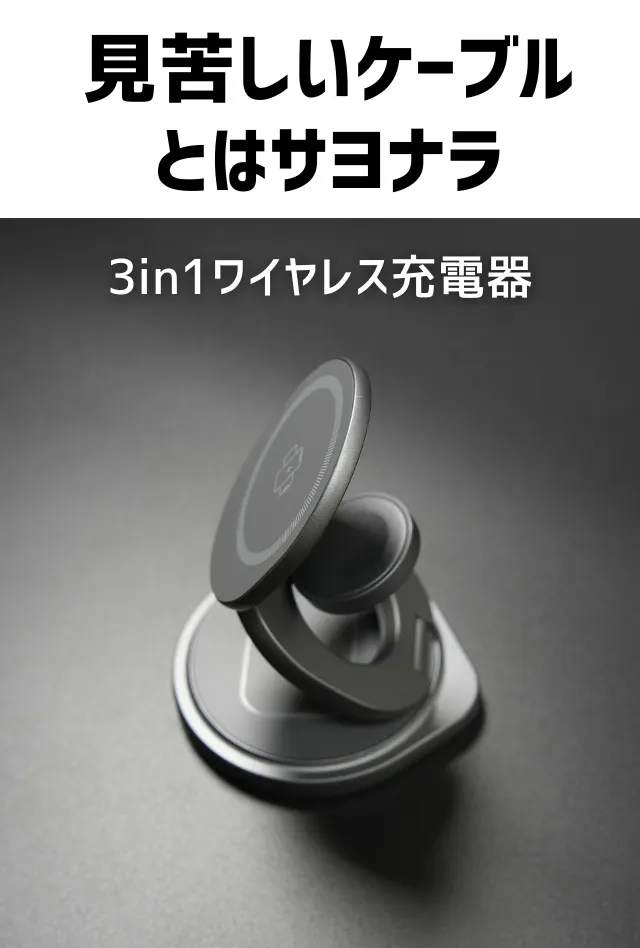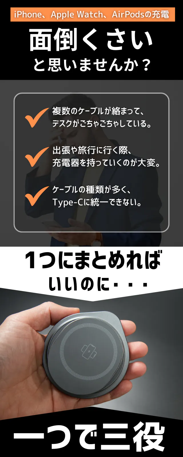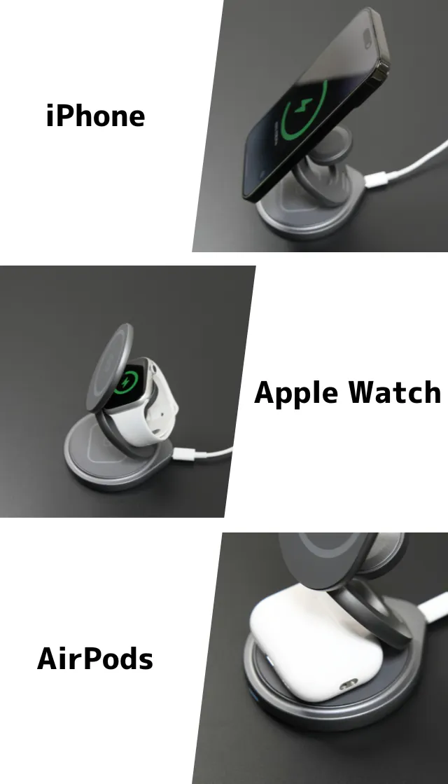 【3in1ワイヤレス充電器】があれば、同時にスマホ、AirPods、Apple Watchに充電出来ます。絡み合ったケーブルと別れ、ケーブル一本で対応でき、テーブルもすっきりになります。ぜひ皆様に使っていただきたいです。