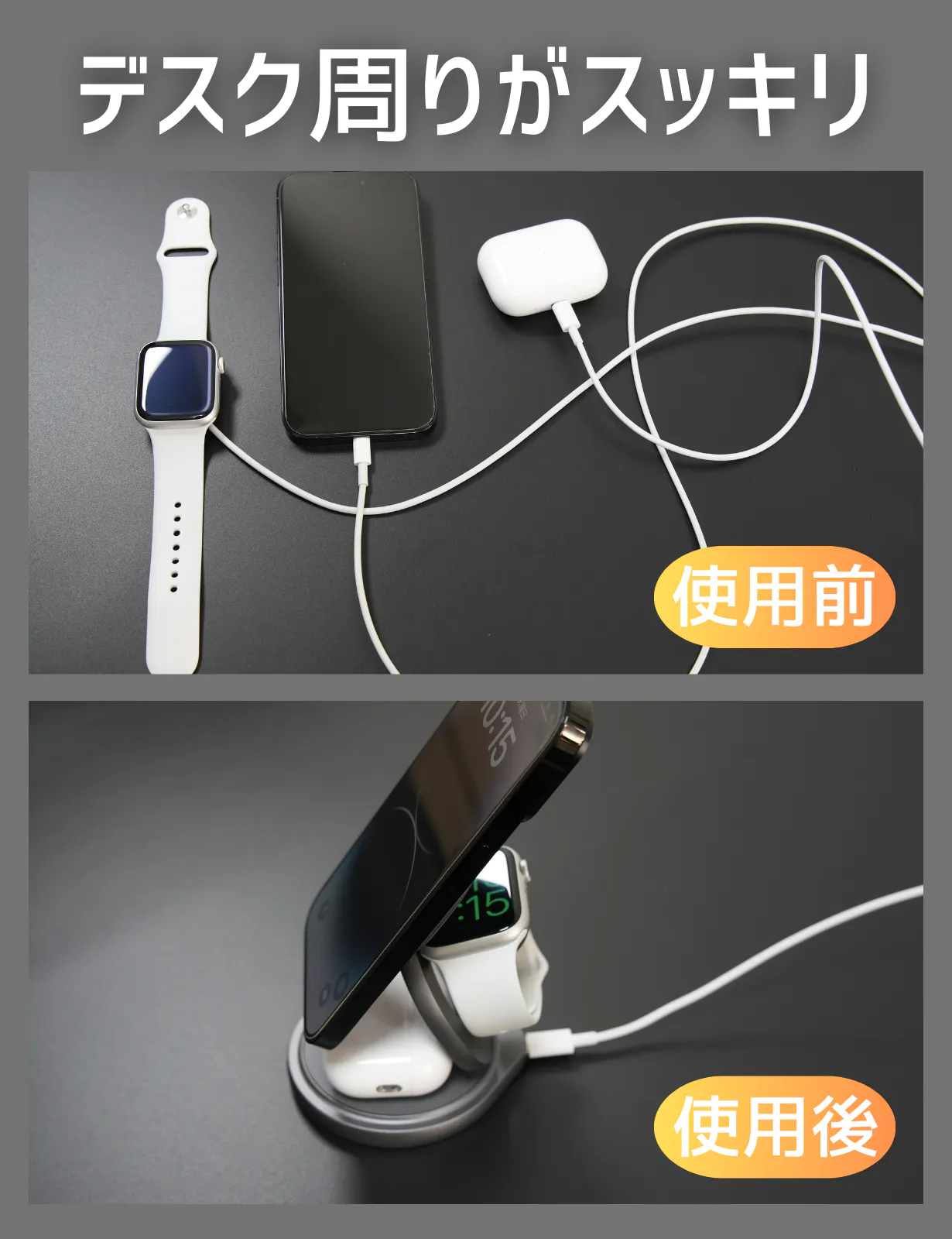 スマートな設計により、iPhone、Apple Watch、AirPodsを同時に充電することができます。これにより、充電ケーブルのわずらわしさから解放され、スマホライフが一層快適になります。