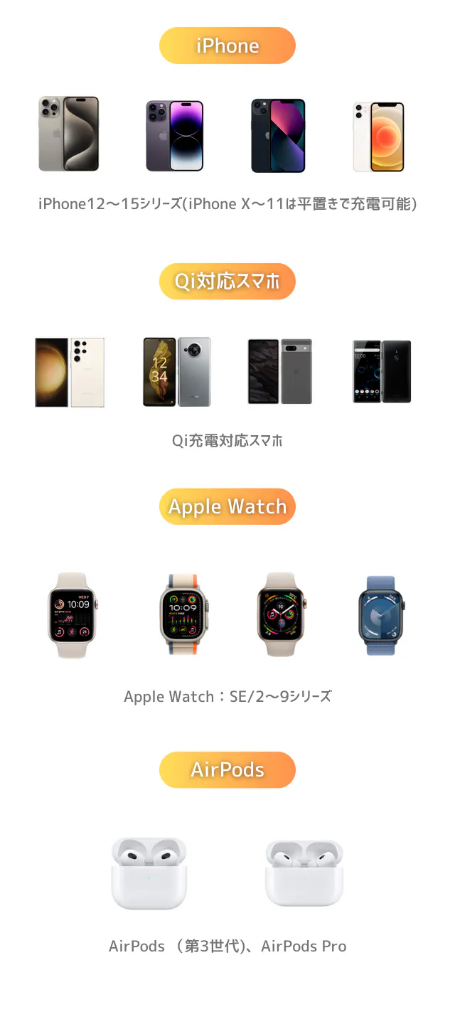 A. Qi対応の製品であれば、平らに置いて充電できます。