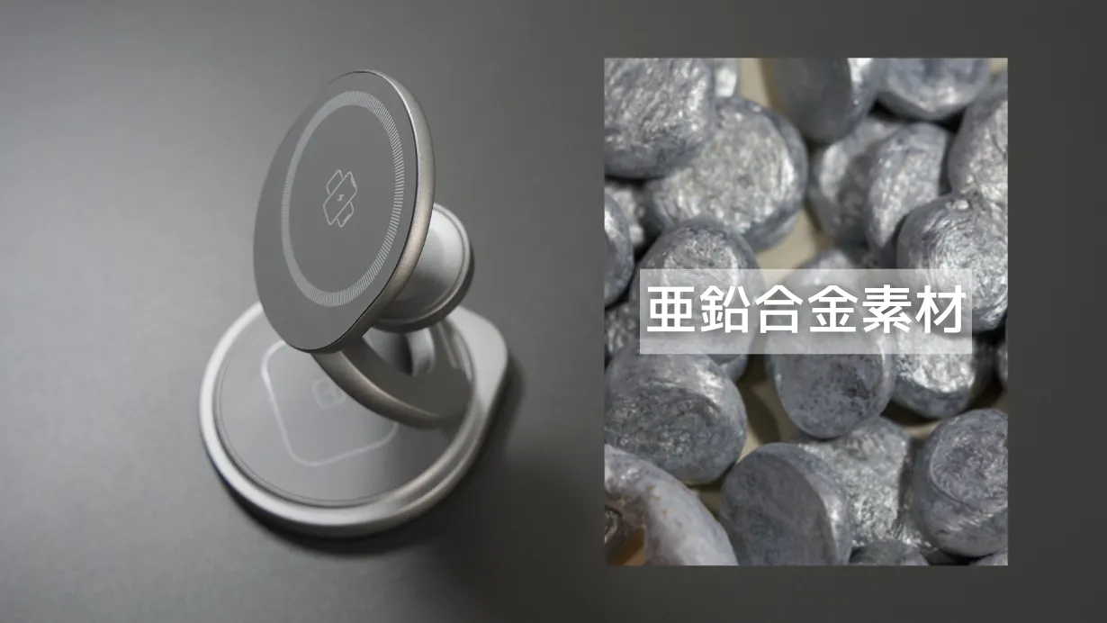 亜鉛合金素材のスタンドボディは、高い耐久性と優れた放熱性を兼ね備えています。熱がたまりにくいので、安心して長時間の充電が可能です。