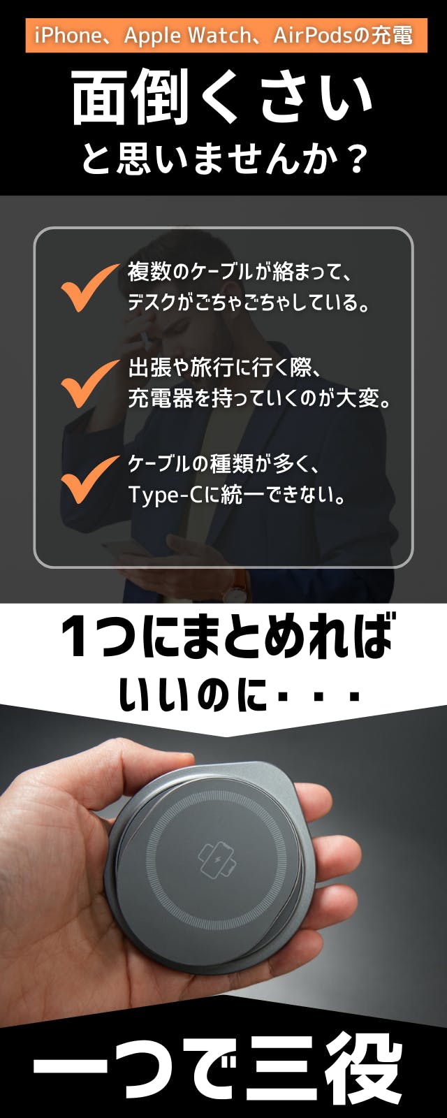【3in1ワイヤレス充電器】があれば、同時にスマホ、AirPods、Apple Watchに充電出来ます。絡み合ったケーブルと別れ、ケーブル一本で対応でき、テーブルもすっきりになります。ぜひ皆様に使っていただきたいです。
