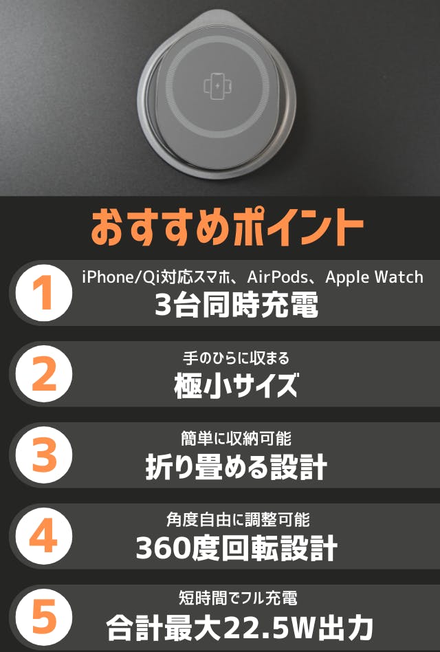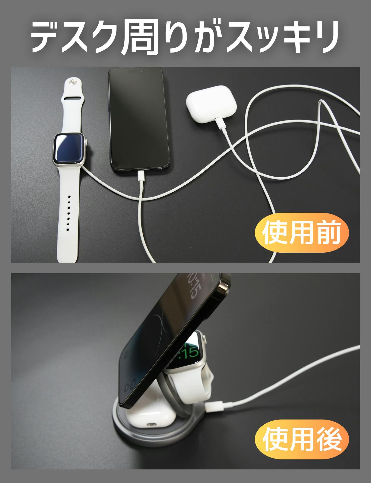 スマートな設計により、iPhone、Apple Watch、AirPodsを同時に充電することができます。これにより、充電ケーブルのわずらわしさから解放され、スマホライフが一層快適になります。