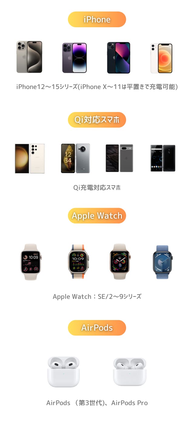 A. Qi対応の製品であれば、平らに置いて充電できます。