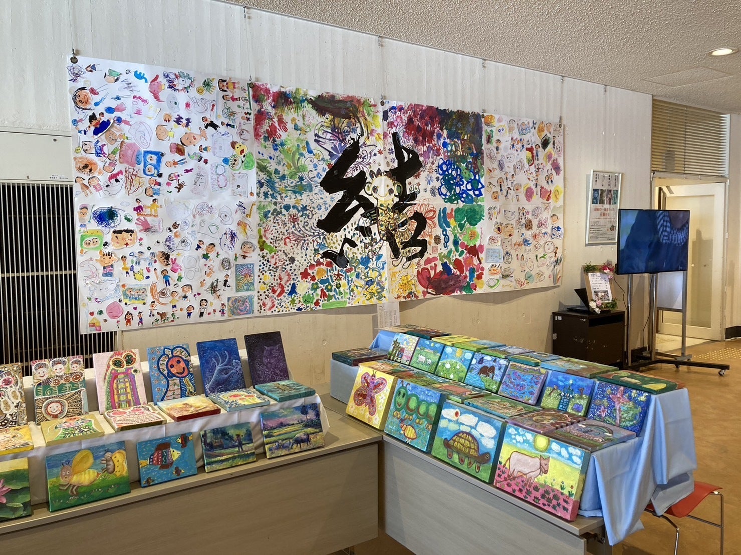 カンボジアのアーティスト2人(Chheav Heaさん、Sor Sovanmunnyさん)と子どもたちとで描いた共同制作作品や小さな美術スクールで描かれた作品の数々はどれも個性的でワクワクするものでした!