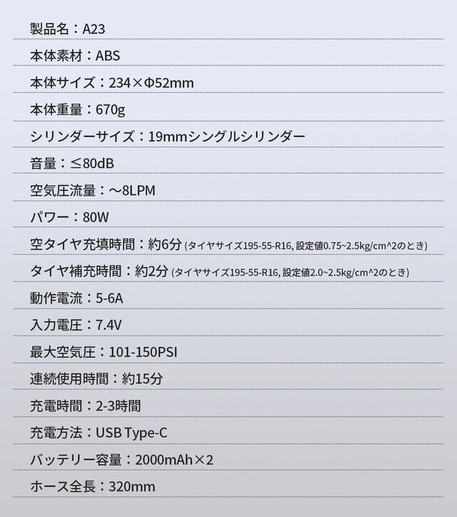自転車やボールなどの軽い空気入れだけじゃなく、車やバイクにもちゃんと使える合計4000mAh。