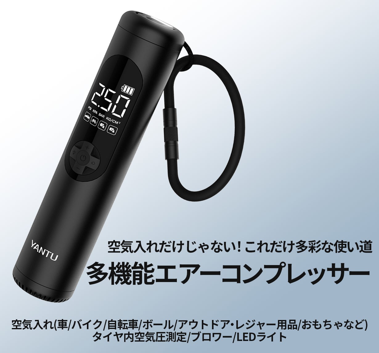 A23は、使いやすくスリムなUSB充電式携帯型エアコンプレッサーです。この製品は、さまざまなお悩みを解決するために進化した優れた機能を備えています。