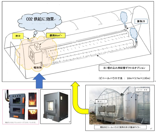 暖房で発生する熱とCO2はハウス内の暖房や農作物育成に寄与できるばかりでなく