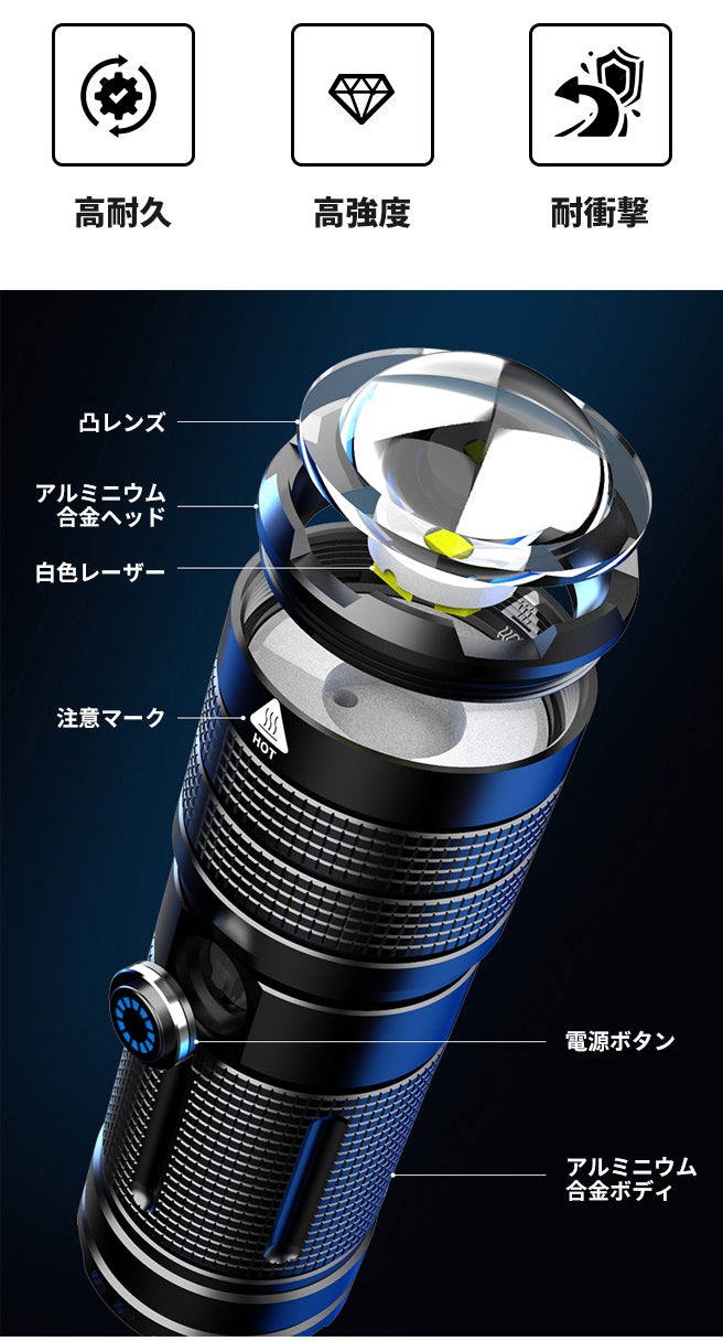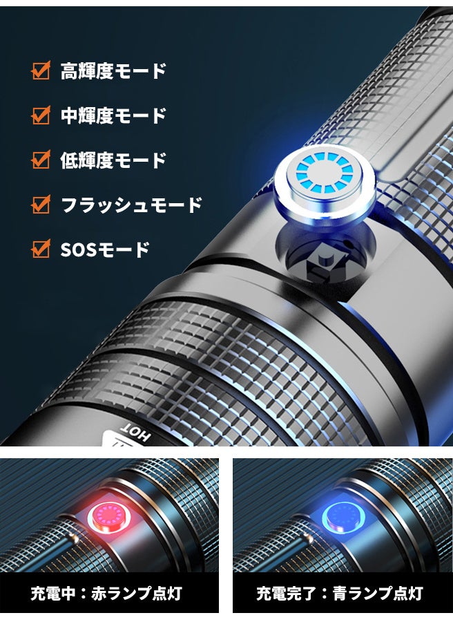 電源ボタンを押すだけで、高輝度、中輝度、低輝度、フラッシュ、SOS、用途に合わせて5つのモードを切り替えすることができます。