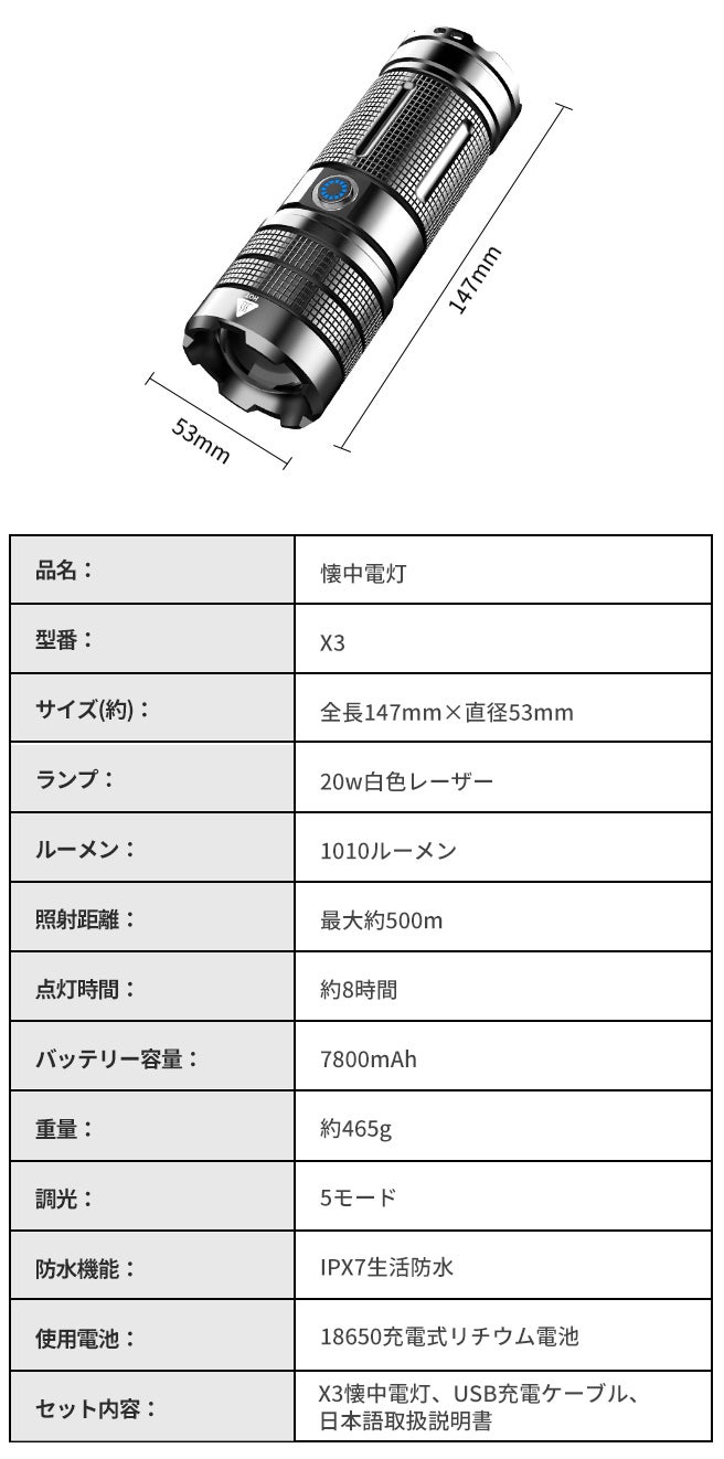 大容量7800mAh 18650リチウムバッテリーが内蔵されており、最大光量時であれば最大約8時間の連続点灯が可能!