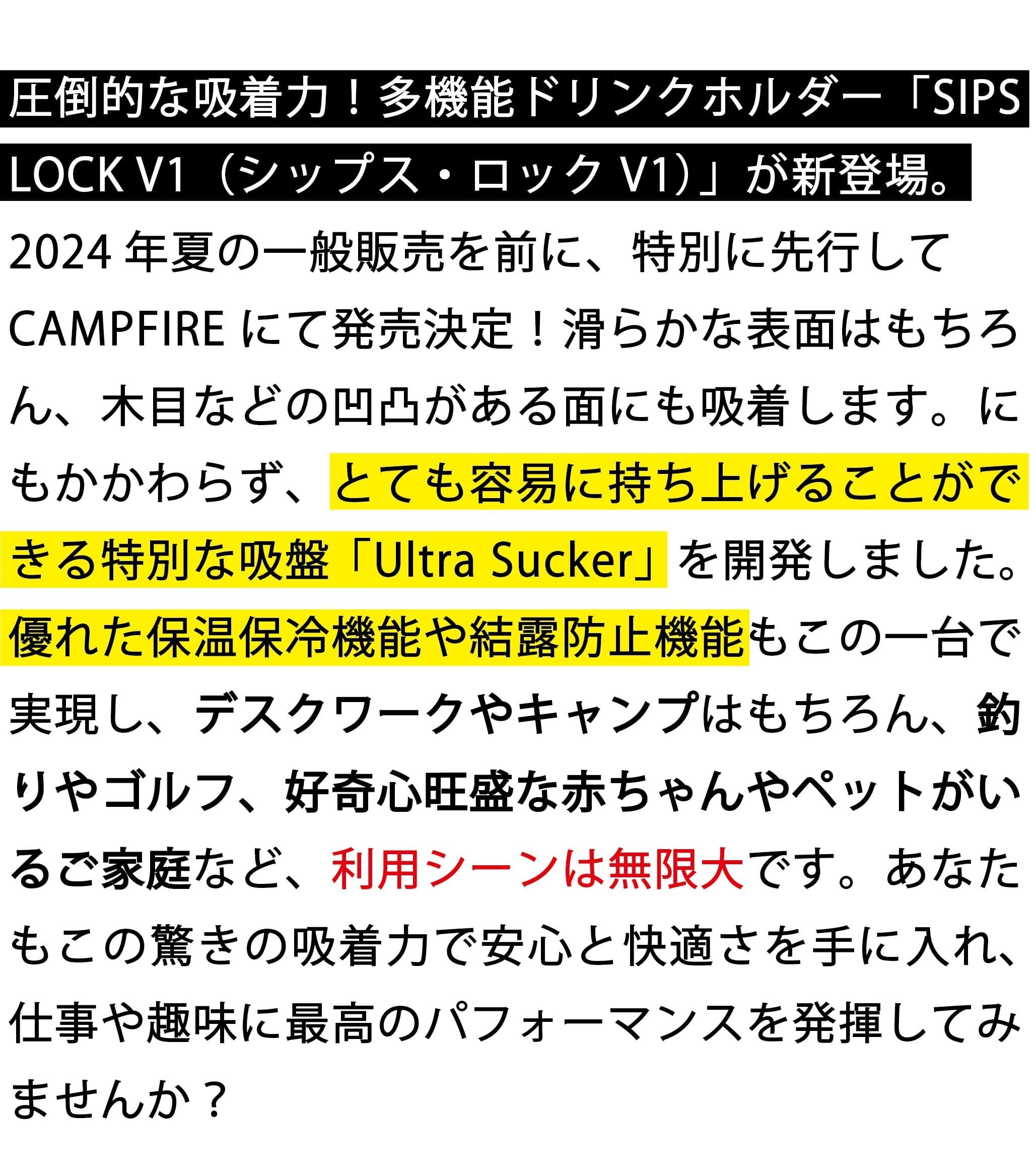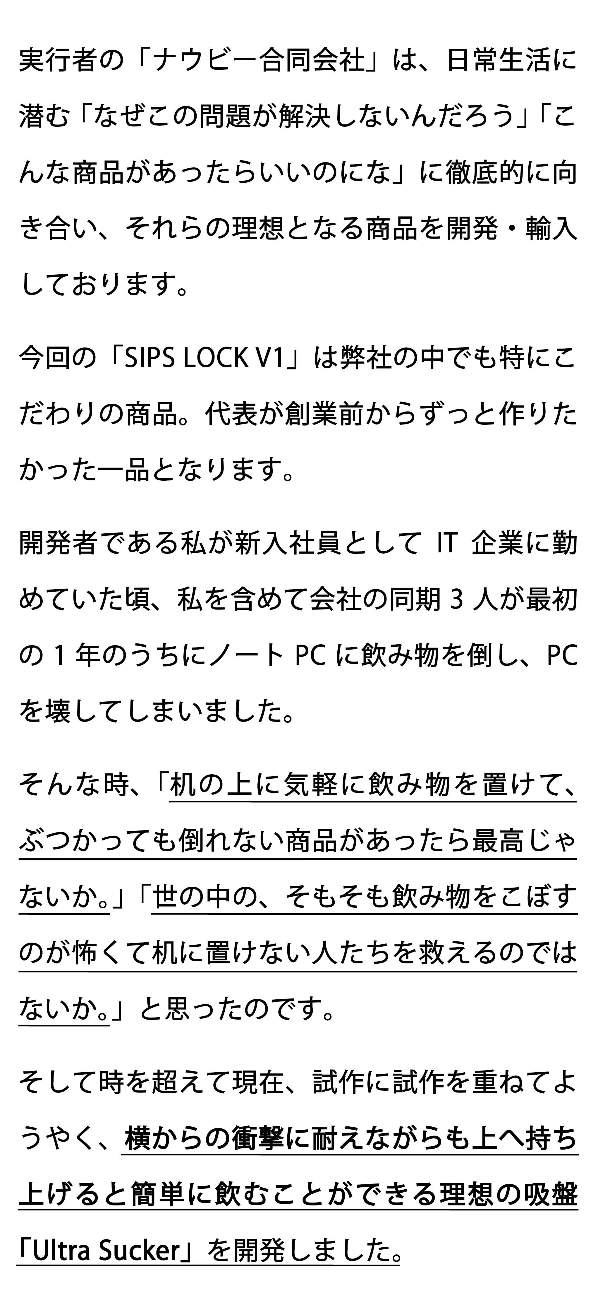 CAMPFIREをご覧くださっている皆様には、是非SIPS LOCKをご使用頂き、今までキャップ付きのペットボトルしか飲むことが出来なかった方々、飲み物を机に置くことが出来なかった方々が、今まで以上の最高のパフォーマンスを発揮していただけましたら、社員一同幸甚の至りでございます。