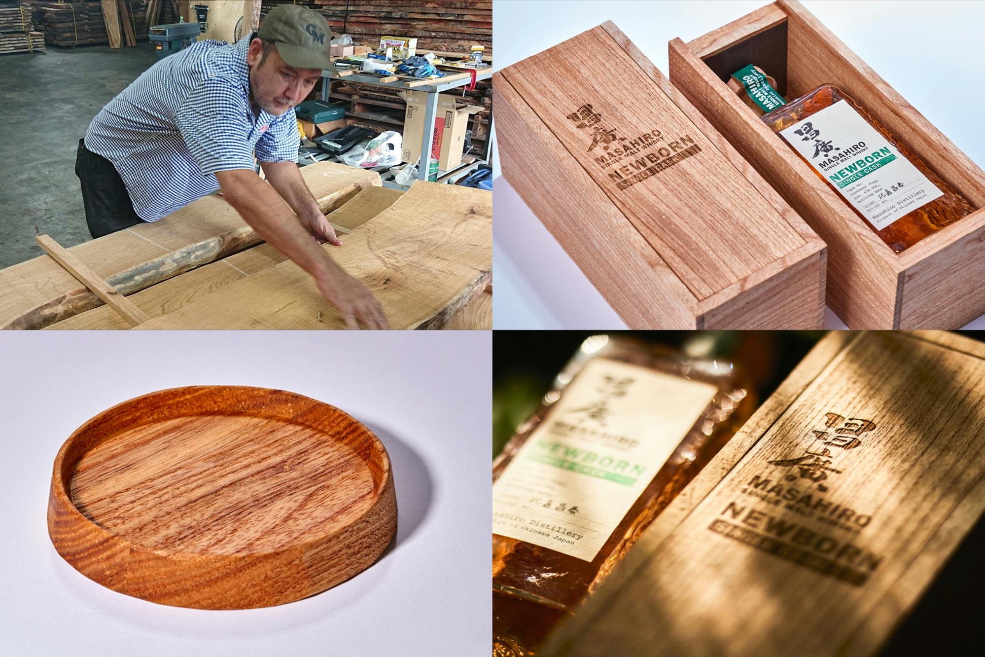 ボトルを大切に保管する外箱は、沖縄県内で手作りの木工製品を手がける「五え松工房」の制作による、沖縄の栴檀(センダン)の木を使った木箱です。栴檀は女児の誕生とともに家に植栽し、結婚の際に材で箪笥をつくる風習もあった木、ということでも知られています。それぞれが微妙に大きさが異なる手作りの琉球ガラスボトルに合わせた木箱を特別に制作してもらいました。またニューボーンウイスキーを楽しむためのこだわりの手作りコースターや黒檀の木を削ったマドラーなども特別に制作していただきました。