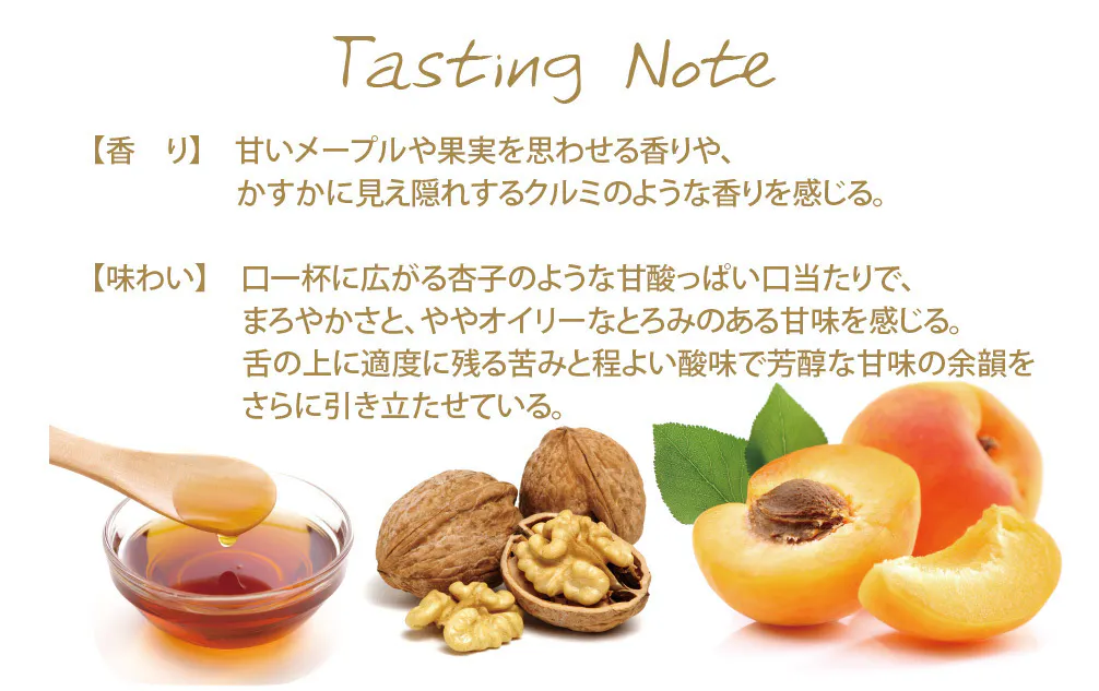 食後酒として、ドライフルーツやチョコレートなどと愉しんでいただくと、お互いの持つ良さを引き出すことができるでしょう。加水すると、蜂蜜を思わせる香りが一気に広がります。