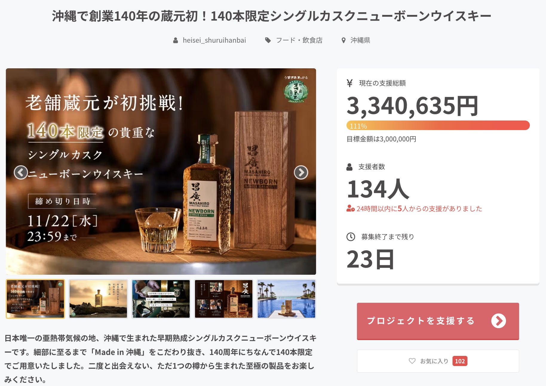 2023/10/27 17:26はいさい!まさひろ酒造の宮里です! おかげさまで、「シングルカスク 昌廣ニューボーンウイスキー」プロジェクトがスタートしてから約5日で、78名もの方にご支援いただき、達成率も65%となりました!完売しているリワード品も出てきており、 本プロジェクトを多くの方にご支援をいただけていることが本当に嬉しく思います。お気に入りに登録いただいている皆様も、ありがとうございます。夜のお時間や週末にかけての購入が増加する傾向にありますので、ご希望のリワード品がある方は、お買い逃しのないよう、お早めにご購入いただければと思います!目標金額まではまだまだ長い道のりですので、引き続き応援や、ご購入いただいた皆様におかれましては本プロジェクトの拡散もどうぞよろしくお願いいたします! もっと見る