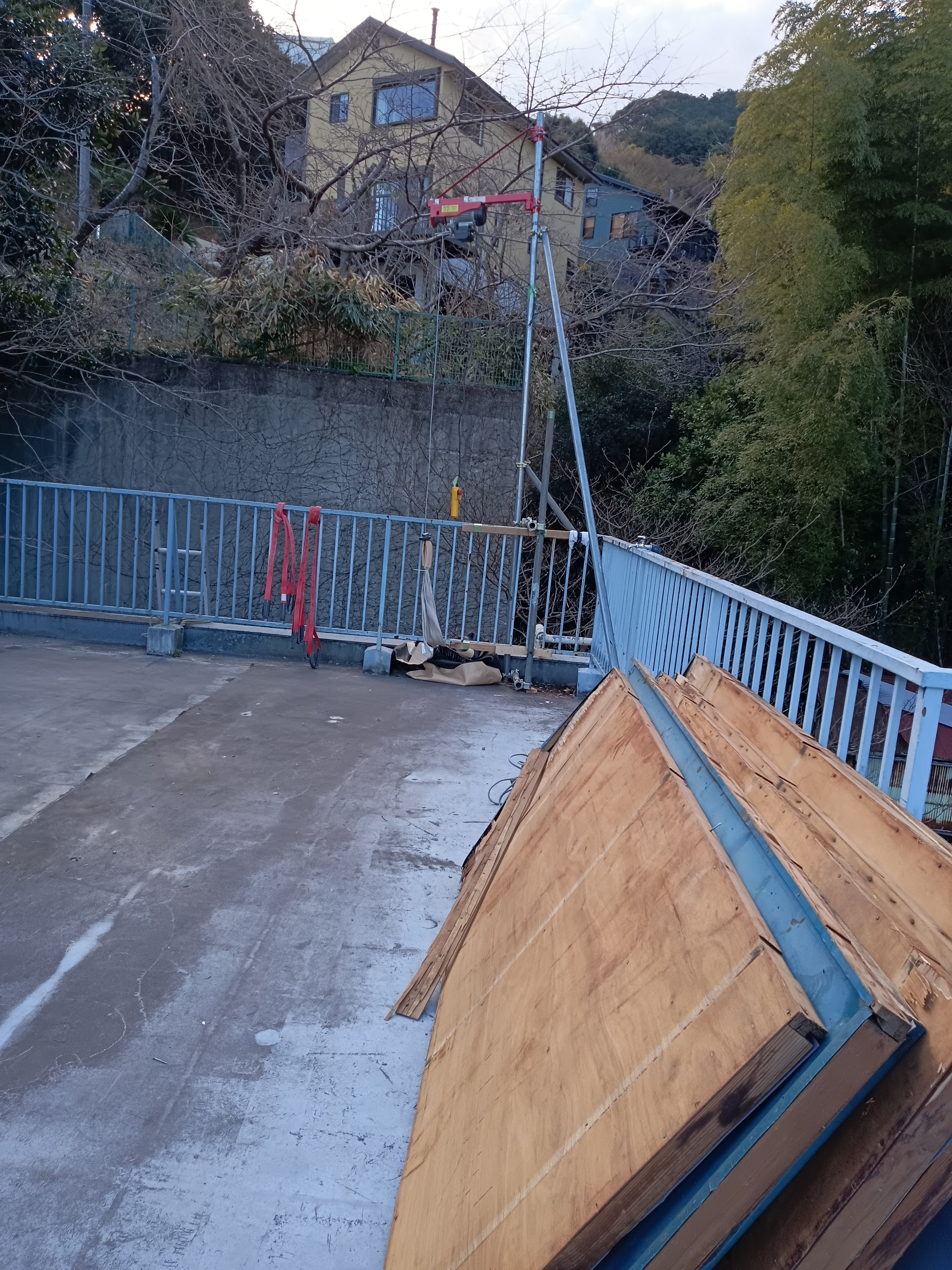 屋上の大きな物置があると消防申請が下りないので、解体しました。このあと防水加工をして、ワンちゃん用プールを設置する予定です。