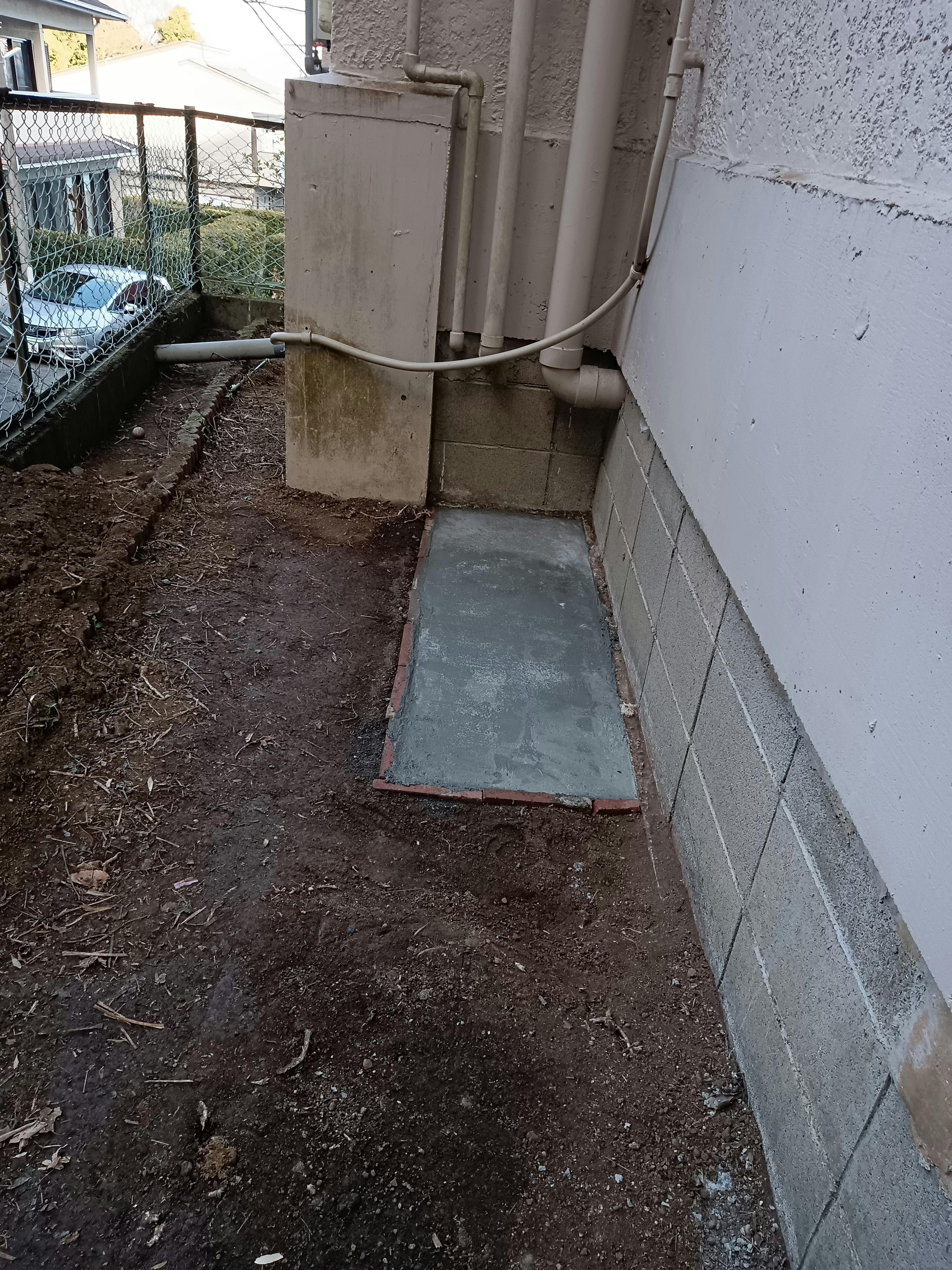 お風呂の機械を置くためにオーナーDIYして土を掘りコンクリートを流してフラットに作りました。