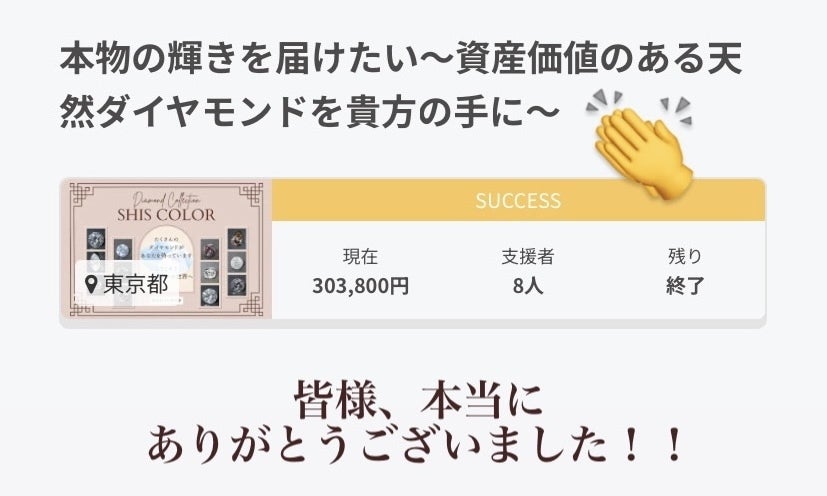 前回Shis Colorは、初めて天然ダイヤモンドクラファンを実施しました。