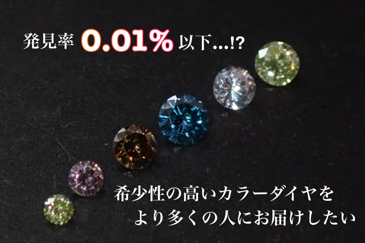 天然のカラーダイヤが産出されるのは僅か0.01%程度で、とても希少性が高いのです!無色透明なダイヤモンドをイメージする方も多いと思いますが、イエロー及びブラウン、またはブルー、グリーン、ピンク、レッドなどと『ない色はない』と言われているほど様々な色が存在します。そんな魅力溢れるカラーダイヤモンド を是非、皆さんに気軽に手に取って、見て、楽しんでほしいと思い今回プロジェクトをやろうと考えました!