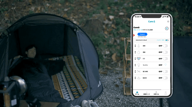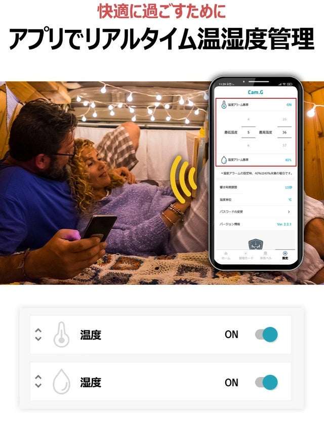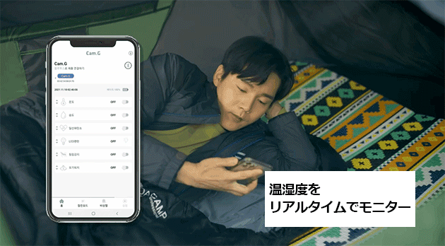 温湿度をリアルタイムでモニタリングするだけでなく、温度・湿度を設定することで高温多湿や低湿度の状態になった際にアラームでお知らせします。キャンプ中に快適に過ごすために、またペットの体調管理にも活用いただけます。
