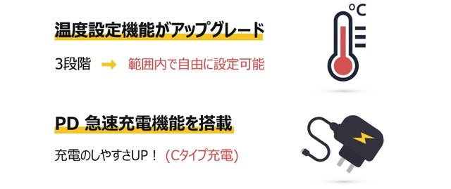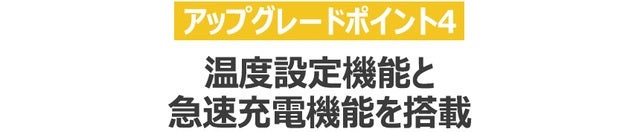 温度の設定機能が3段階ではなく、範囲内で自由に設定できるようになりました。また、急速充電にも対応しています。
