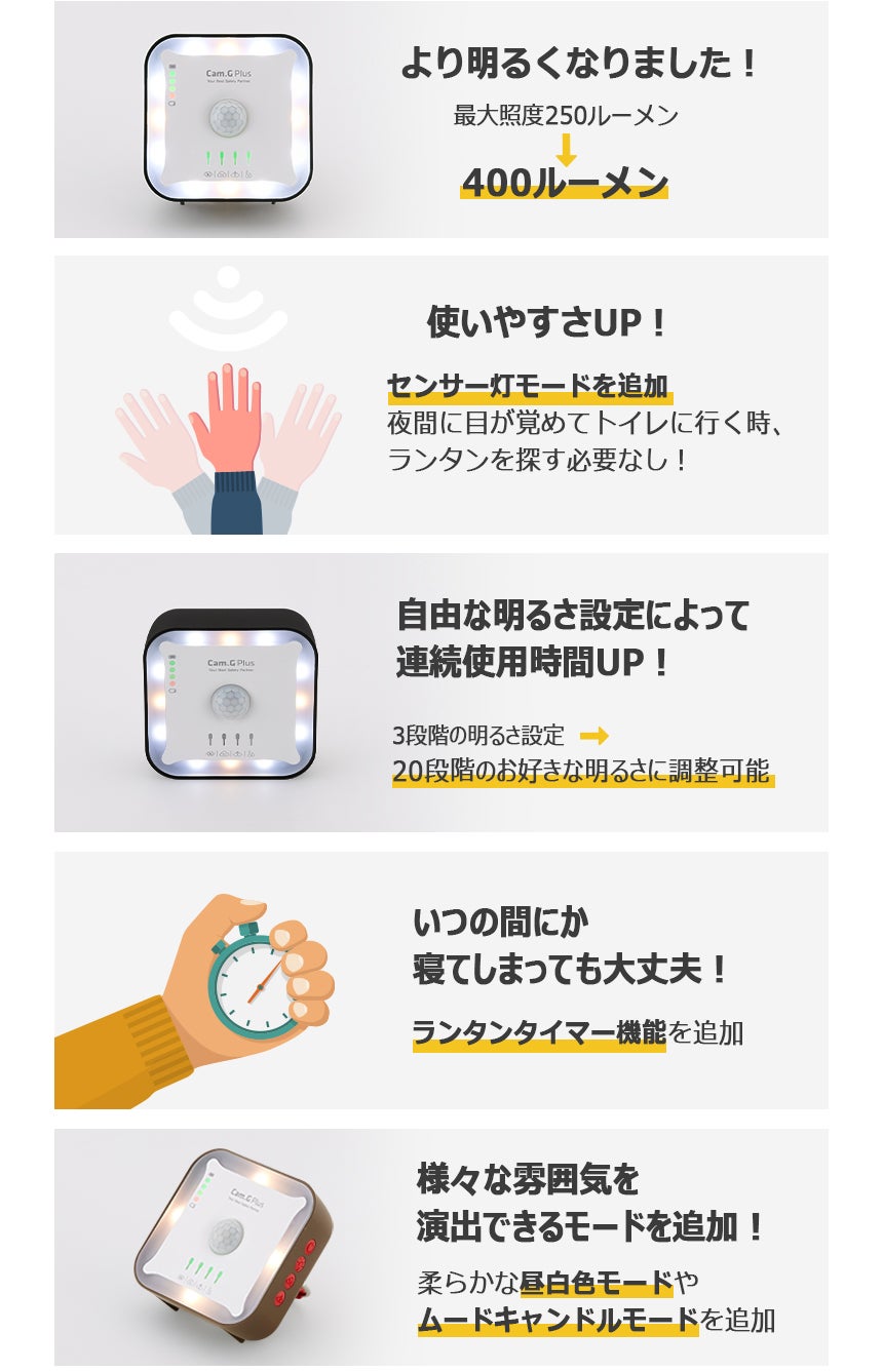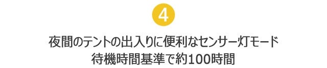 「少し暗いかも…」というようなご意見もいただいていたLEDランタン機能。明るさやモードだけでなく、センサー灯機能やタイマー機能など様々にアップグレードしました!