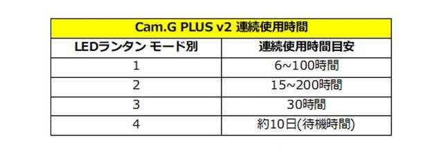 「Cam.g PLUS V2」は手のひらミニサイズの本体にキャンプで必要な6大機能を詰め込んでいます。たった220gと軽量で、縦横10㎝のコンパクトなサイズで持ち運びにとても便利です。