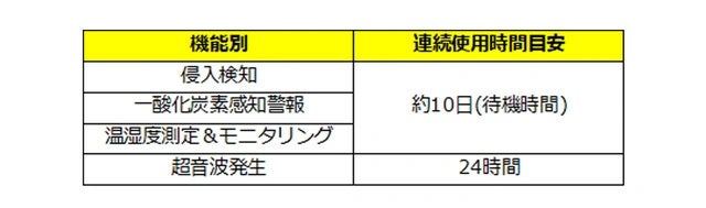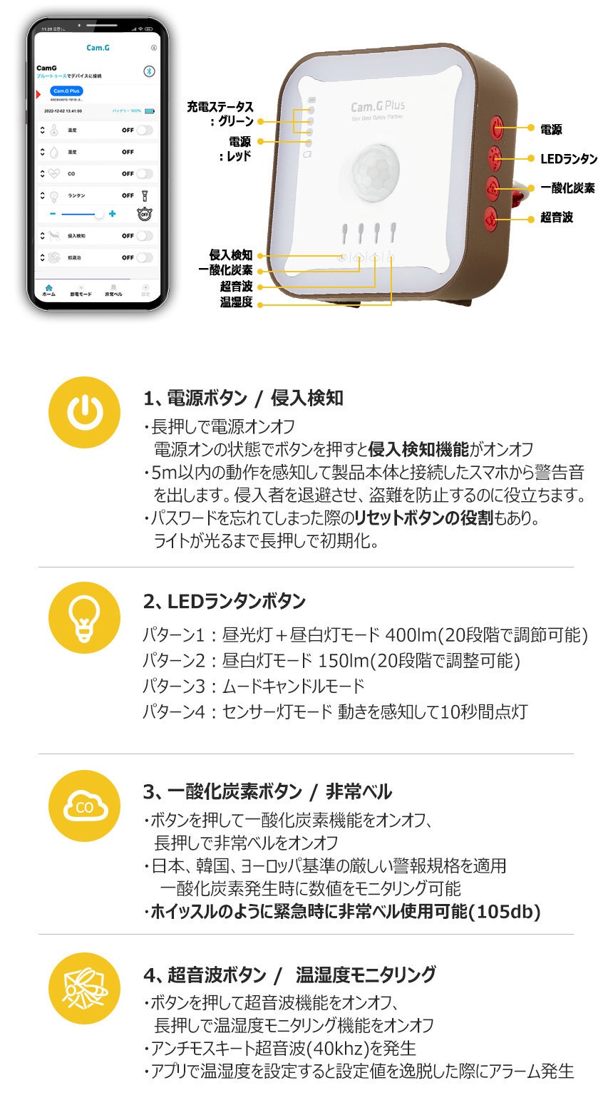 A、 本製品には、侵入検知アラーム・一酸化炭素警告・虫が嫌がる超音波発生・温湿度モニタリング・LEDランタン・非常ベルの6大機能が搭載された多機能セキュリティツールです。