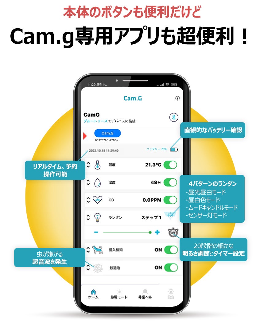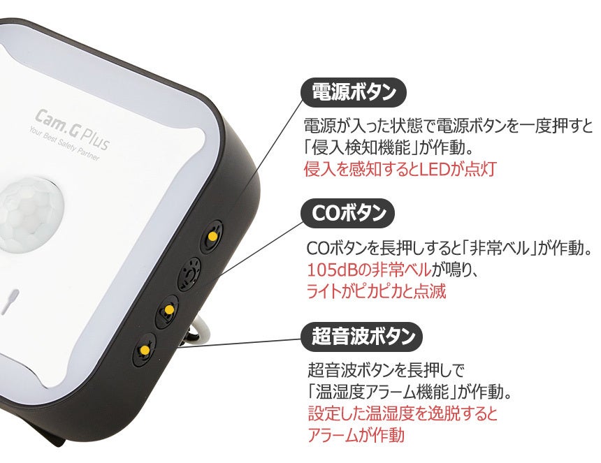 前製品ではCam.gアプリと接続しないと使えなかった機能、侵入検知機能・非常ベル機能・温湿度アラーム機能が本体のボタンだけでコントロール可能になりました。