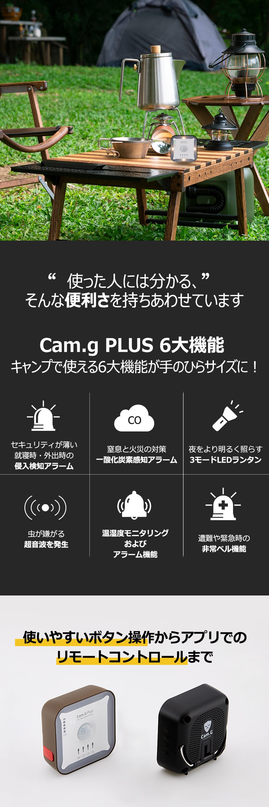 この度、アップグレードしたポータブルセキュリティツール「Cam.G PLUS」の新カラーVer.(ブラック、ブラウン)をご紹介しております。キャンプなどのアウトドア活動、さらには普段からも使える心強い6大機能が揃ったマルチツールです。Cam.GとはCAMPING GUARD(キャンピングガード)の略字です。この製品で皆さまの日常やアウトドア活動が少しでも安全に豊かに過ごせるようになることを願っています。
