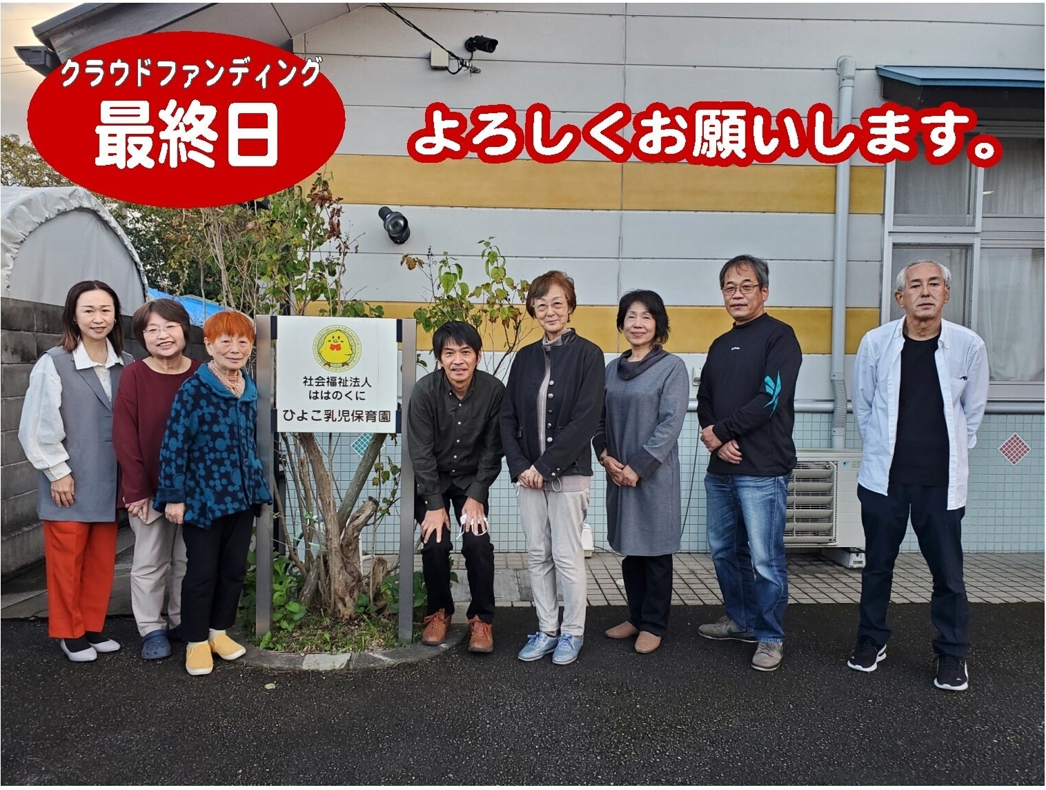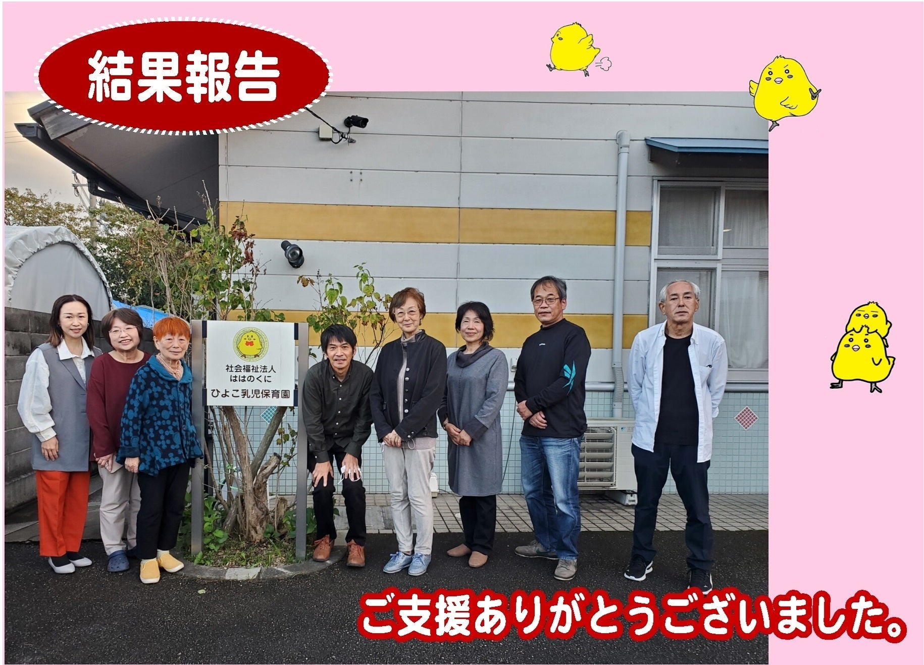 クラウドファンディングの結果報告をさせていただきます。(1)クラウドファンディングによる支援金合計金額 3,130,000円 (支援者数 130人)(2)法人への直接寄付による支援金合計金額 3,828,000円 (支援者数 109人)(3)全ての支援金合計金額 6,958,000円(支援者数 239人)以上、目標を達成することができました。たくさんのご支援本当にありがとうございました。私たちのプロジェクトを応援してくださったみなさん、本当にありがとうございました。おかげさまで、クラウドファンディングと法人への直接寄付をあわせて目標の金額を達成することができました。みなさんからのご寄付は、子育て支援センター『のんびりぴよっこ』の成功のために大切に使わせていただきます。ご寄付を寄せていただいた方を見ていますと、無認可の共同保育所時代からの懐かしいお名前にも出会います。現役の保護者のみなさん、卒園生の保護者、関係者のみなさん、地域のみなさん…。今回のプロジェクトを通して初めてひよこ乳児保育園のことを知り、応援しようと思ってくださった方もいらっしゃるでしょう。お一人お一人にお会いし感謝の気持ちを届けたい、そんな気持ちでいっぱいです。クラウドファンディングはゴールを迎えましたが、もちろんこれは通過点にすぎません。これからが本当のスタートです。期間中に寄せられた期待の声に応えられるよう、現場の職員が中心となってしっかりと中身を検討し、地域の子育て支援センターとして、その役割を果していきたいと思います。今後とも変わらぬご支援をどうかよろしくお願いします。(社会福祉法人 ははのくに 理事長 立岡妙子)*建設工事の進捗状況や取り組みの状況については、そのつど活動報告等で共有させていただきます。引き続き応援のほどよろしくお願いいたします。