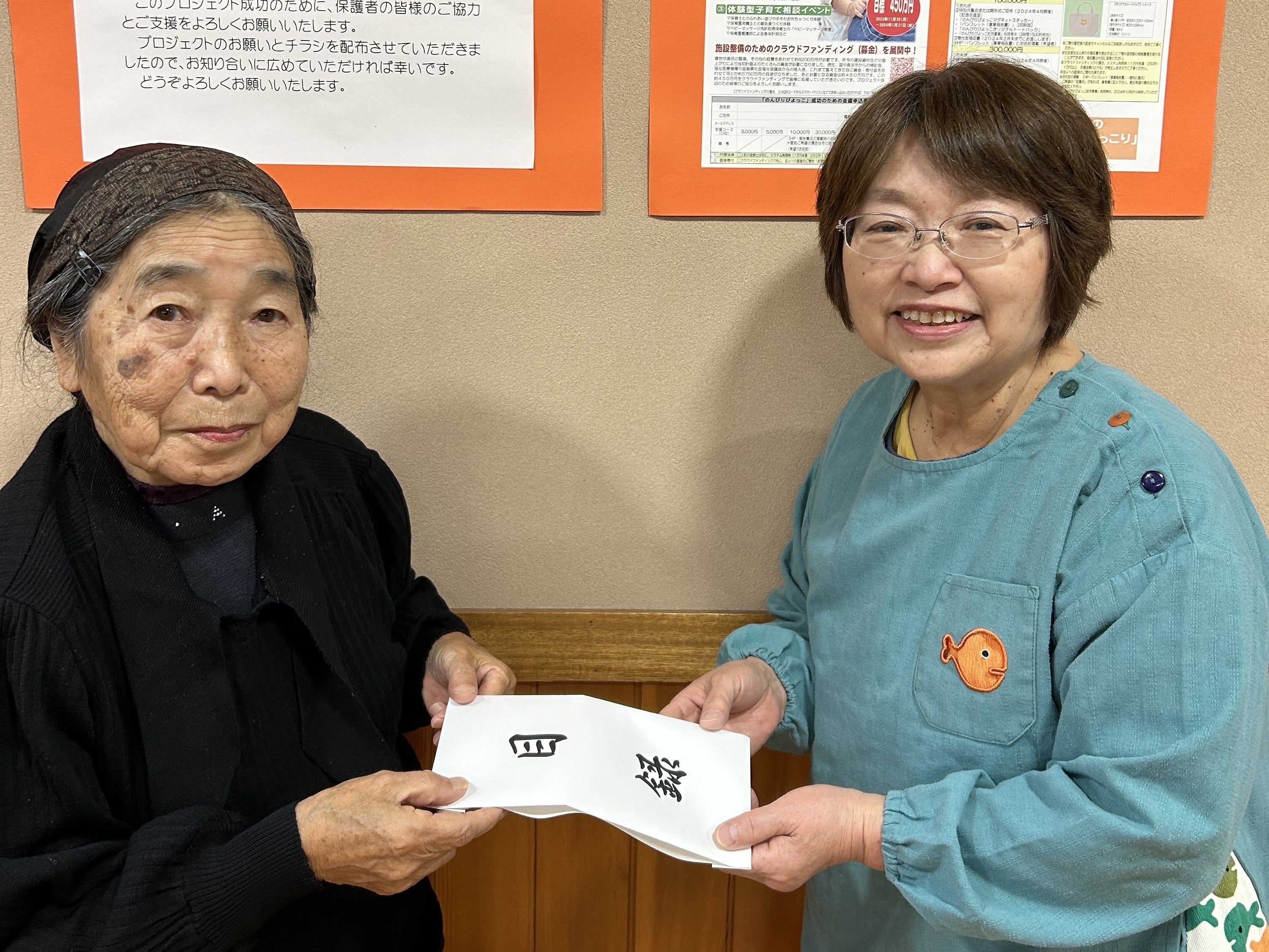 ひよこ乳児保育園後援会会長の小林きよさんから、後援会活動で蓄えた資金100万円をご寄付いただきました。(写真は、保育園を訪れ狩野園長に目録を渡す小林さん)小林さんは「映画会の開催やいわさきちひろ等のカレンダー販売、物資あっせんなど後援会の活動でこつこつと貯めてきたものです。子育て支援センター『のんびりぴよっこ』の事業を成功させるために大切に活用してください」と話されました。後援会関係者のみなさん、いつも後援会の活動を応援くださっているみなさん、本当にありがとうございます。この度いただいた寄付金は、子育て支援センター『のんびりぴよっこ』のために大切の使わせていただきます。今後ともご支援どうかよろしくお願いします。
