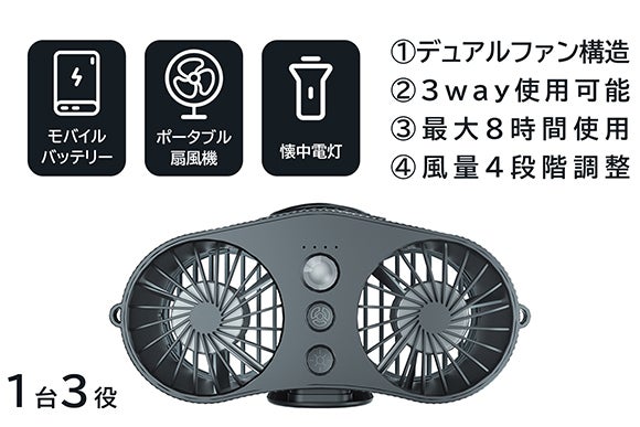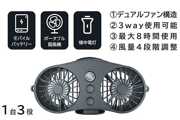 ■1台3役。モバイルバッテリー・懐中電灯・ポータブル扇風機
