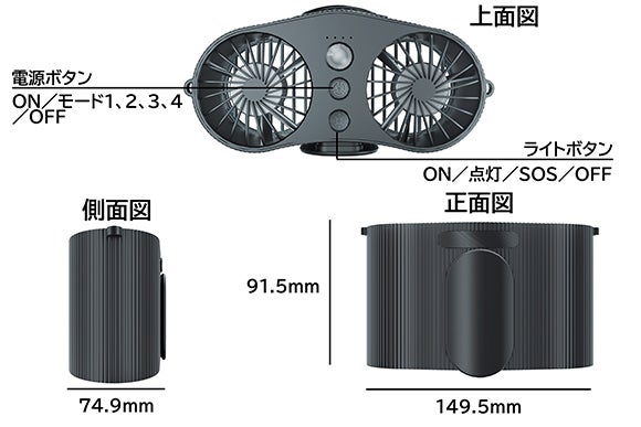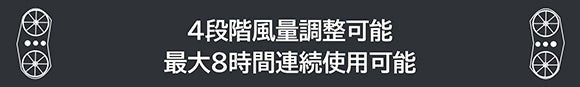 風量モード(利用時間、騒音):モード1(約8時間、約52dB)、モード2(約6.5時間、約56dB)、モード3(約5.5時間、約58dB)、モード4(約4時間、約62dB)