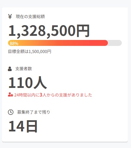 ご支援ありがとうございます!!130万円まで達成しました!