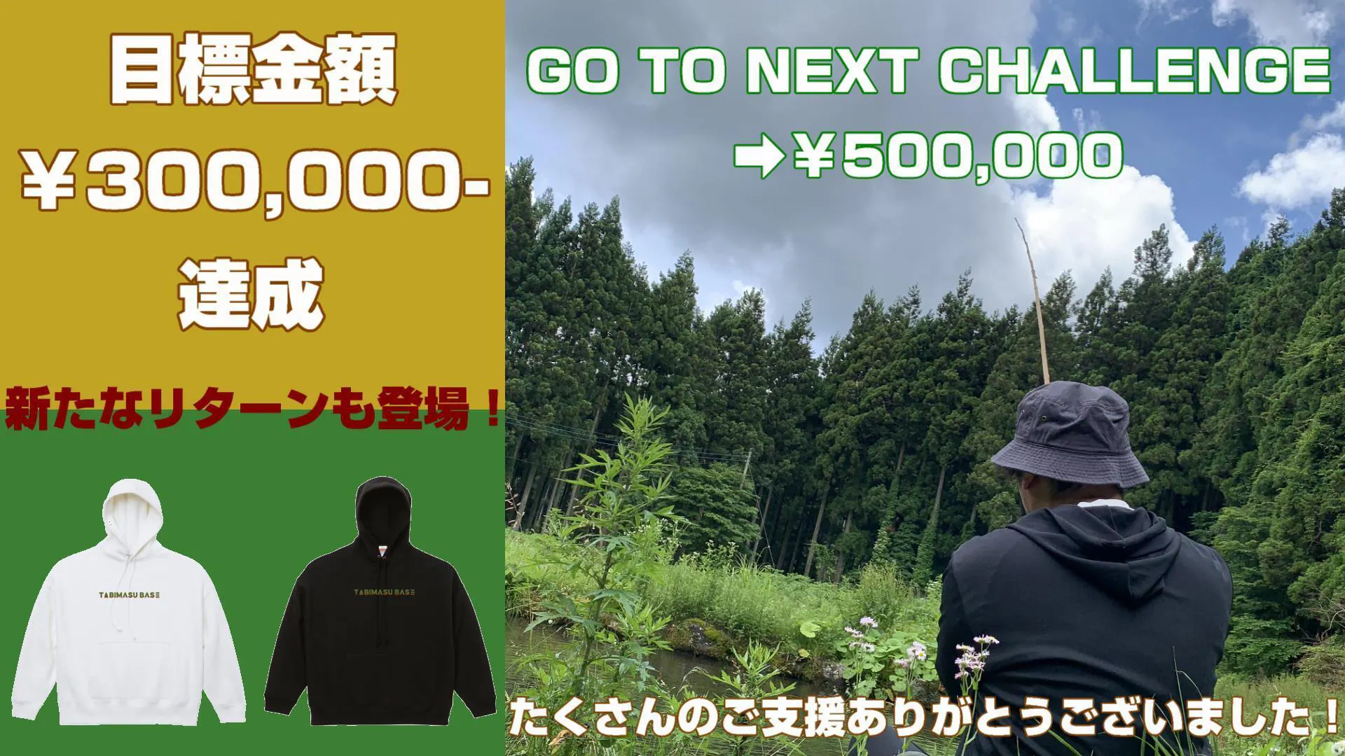 2023/09/02 09:00タイトルにありますが残り1か月を残し『釣場再生』プロジェクト、目標金額¥300,000-を達成いたしました。ご支援いただきました皆様、本当にありがとうございます。プロジェクト本文にもありますように次なる目標を立て、引き続き『TABIMASU BASE~yanagisawa~』を魅力ある管理釣り場にして行きたいと思っております。次なる目標金額は¥500,000-この目標金額を達成すべく新たなリターンをご用意いたしました!!・TABIMASU BASEオリジナルパーカー(ビックシルエット)サイズ/M,L,XLカラー/ホワイト,ブラック限定数/40着シンプルでかわいい『TABIMASU BASE』オリジナルロゴをワンポイントにしたパーカーです。大き目でラフなスタイル、管理釣り場の釣りにもお洒落に着こなせます・///・TABIMASU BASE年間利用権初回利用時より1年間のフリーパスチケット・///詳細はリターンページを参照ください。本プロジェクト締め切りは2023年9月30日まで引き続きたくさんの応援、ご支援の程よろしくお願いいたします。 もっと見る