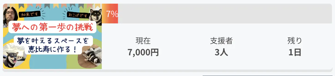 2023/10/07 20:00クラファンが終了しました!お疲れ様ですリノスペのカワカミです。31日間のクラウドファンディングが終了しました!結果は15,800円、6名のご支援者様という結果でした。なかなかオーガニック流入が取れず苦戦し、リノスペ関係者に直接お願いした結果でした。リノスペとして記事の作成代行をしたのは今回で3回目でしたが、記事を作成した僕自身ものおすごくいい経験でした!そしてご支援していただいた方、拡散していただいた方、活動報告を読んでいただいた方、みなさんありがとうございました!今回の主役スペースであるkitchen恵比寿202、そしてオーナーが加来さんの新店舗kitchen麹町は順調に予約が入っております。クラファンではなかなかいい結果は出ませんでしたが、スペースの運営は順調に進んで加来さん自身も安心していただけて、運営チームの僕たちもオーナーさんが喜んでくれるのはものすごく嬉しいことです!スペースの運営はまだまだ終わりません。引き続きゲスト満足を意識して毎日運営していきますのでよろしくお願いいたします! もっと見る