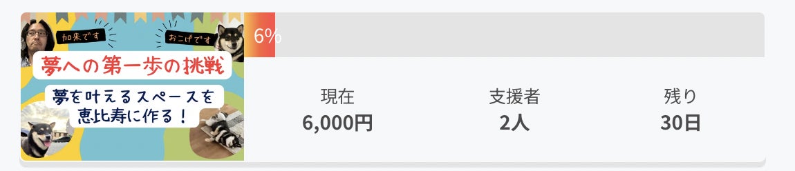 現在6,000円で目標まで残り94%!活動報告も毎日更新しますので残り30日間もよろしくお願いいたします。