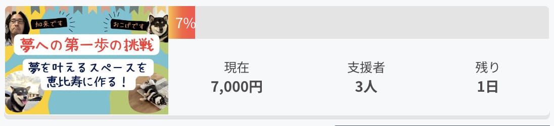 2023/10/07 20:00クラファンが終了しました!お疲れ様ですリノスペのカワカミです。31日間のクラウドファンディングが終了しました!結果は15,800円、6名のご支援者様という結果でした。なかなかオーガニック流入が取れず苦戦し、リノスペ関係者に直接お願いした結果でした。リノスペとして記事の作成代行をしたのは今回で3回目でしたが、記事を作成した僕自身ものおすごくいい経験でした!そしてご支援していただいた方、拡散していただいた方、活動報告を読んでいただいた方、みなさんありがとうございました!今回の主役スペースであるkitchen恵比寿202、そしてオーナーが加来さんの新店舗kitchen麹町は順調に予約が入っております。クラファンではなかなかいい結果は出ませんでしたが、スペースの運営は順調に進んで加来さん自身も安心していただけて、運営チームの僕たちもオーナーさんが喜んでくれるのはものすごく嬉しいことです!スペースの運営はまだまだ終わりません。引き続きゲスト満足を意識して毎日運営していきますのでよろしくお願いいたします! もっと見る