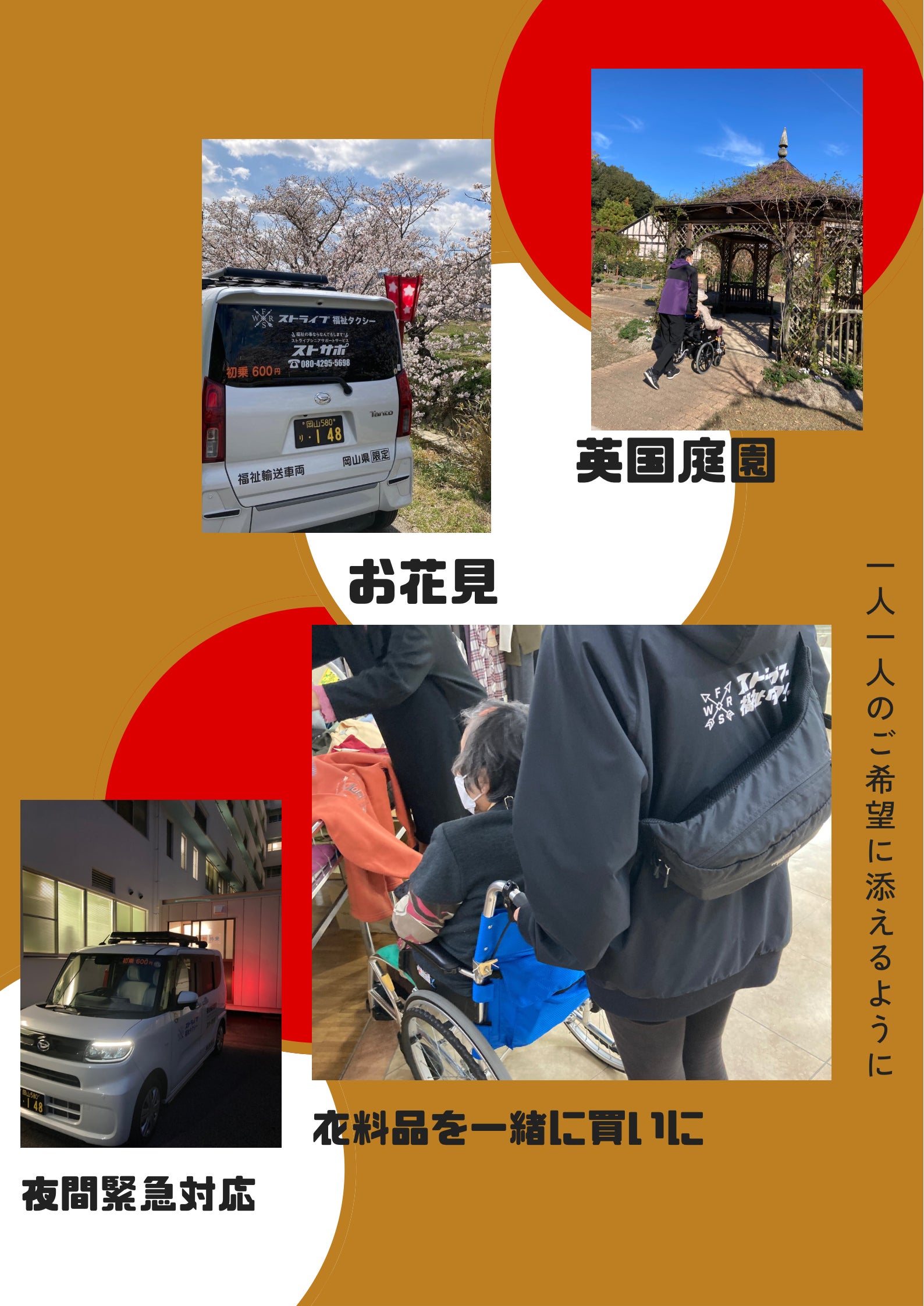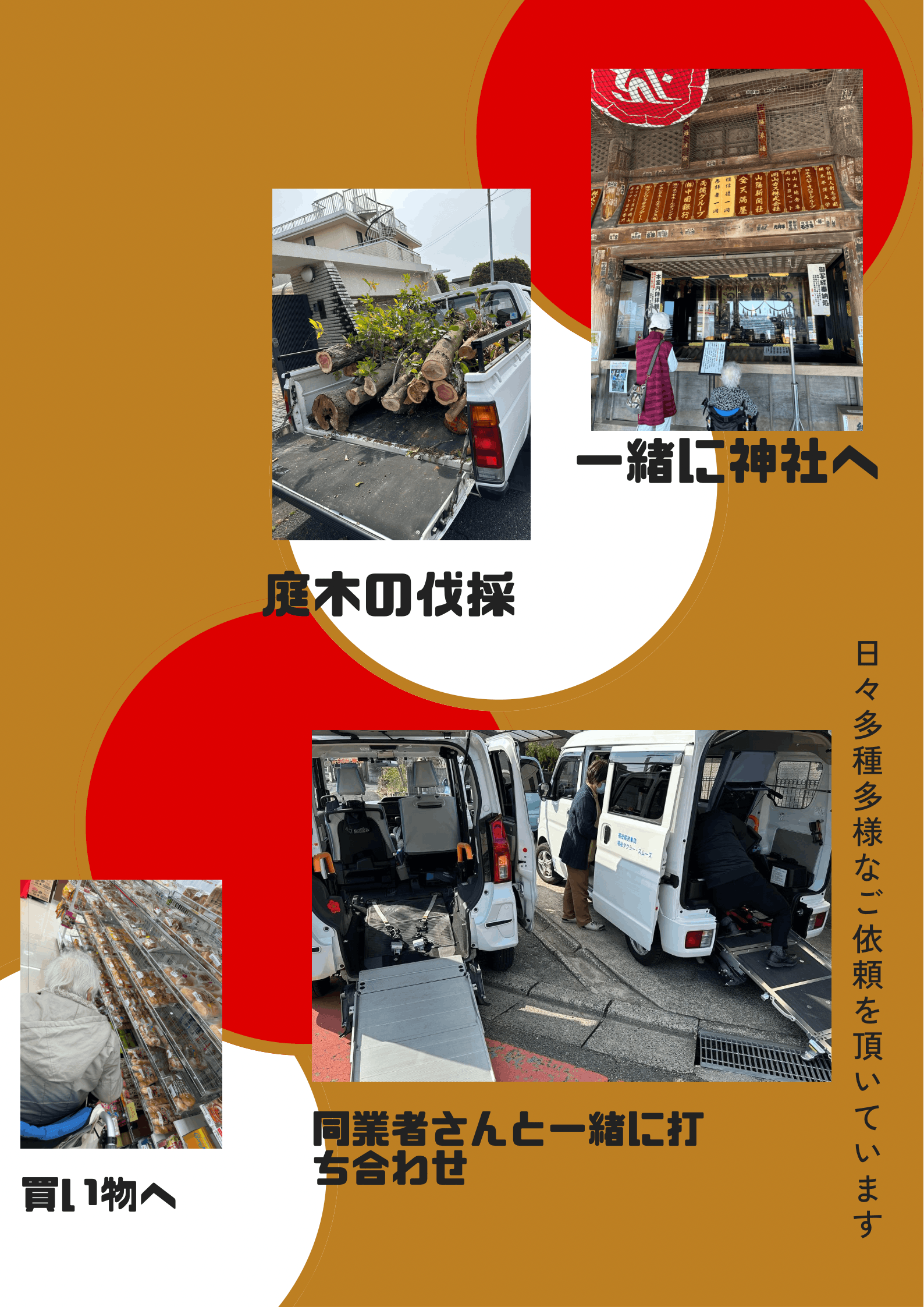 病院への付き添い、買い物、美容院への送迎、お友達と一緒に行楽
