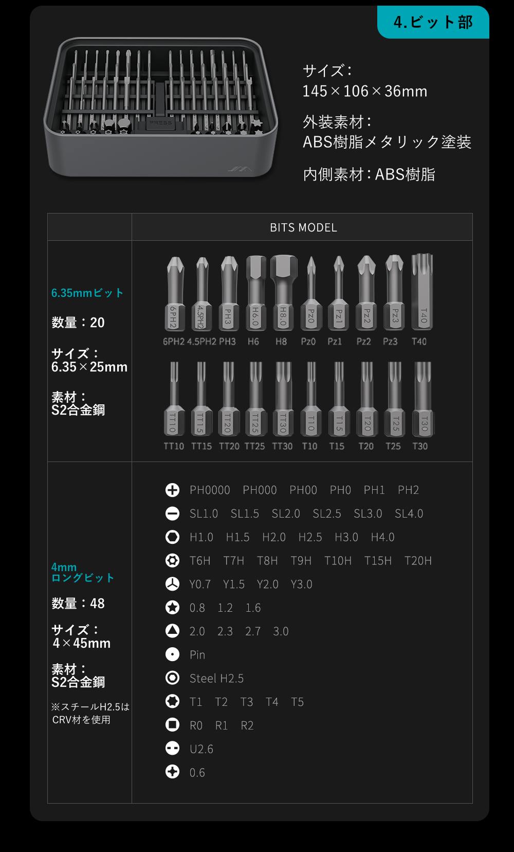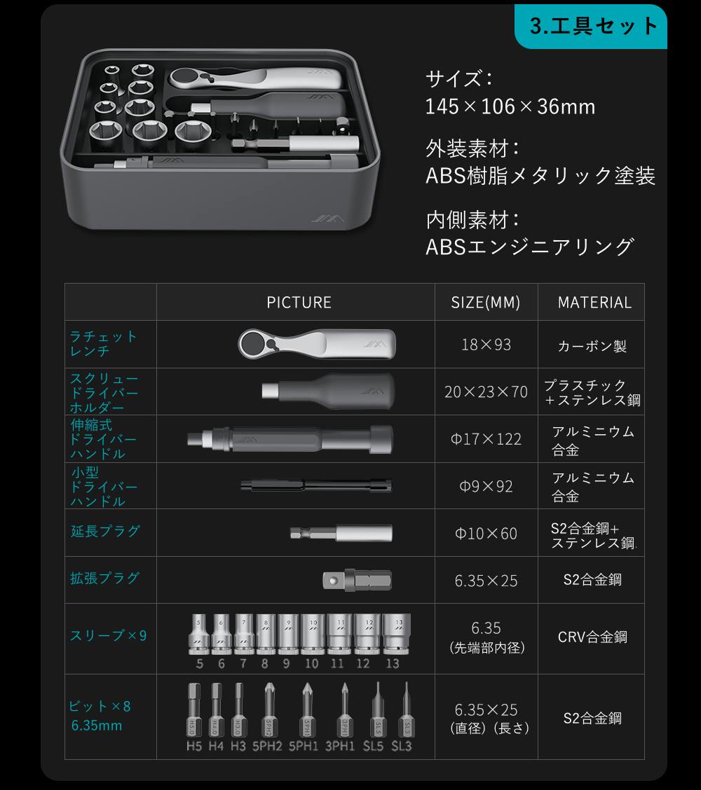 JIMIBOX 3.0には、DIYや精密機器の修理で活躍する全100種のツールが揃っているため、追加でビットやピンセットなどのツールを購入する必要はありません。
