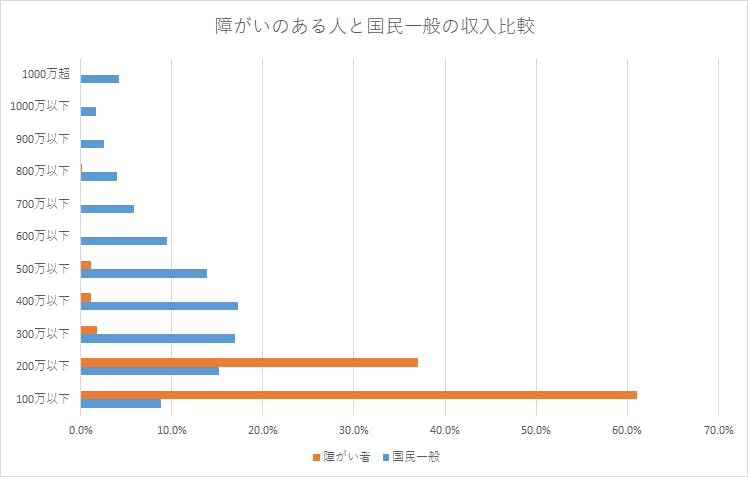 これは、2015年に実施された「障害のある人の地域生活実態調査」から抜粋した収入比較データです。