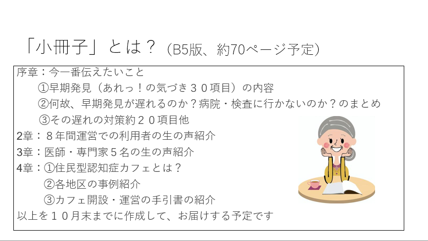 私たちは、更に困っている認知症ご本人・ご家族そして心配で不安な多くの一般市民の為に県内更には、全国各地にこの取組を紹介していければと考えています。 是非、この活動にご賛同を頂き小冊子の完成とお届け、各地域に認知症【予防】カフェの開設を継続していく取組に、多大なご支援ご協力をお願いしたいと考えています。