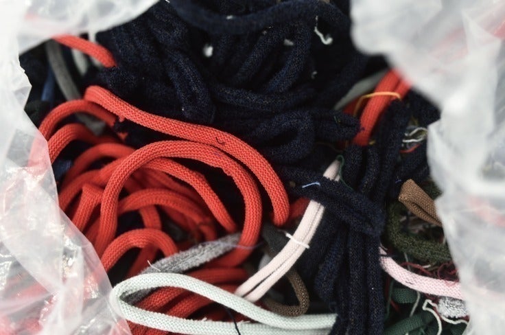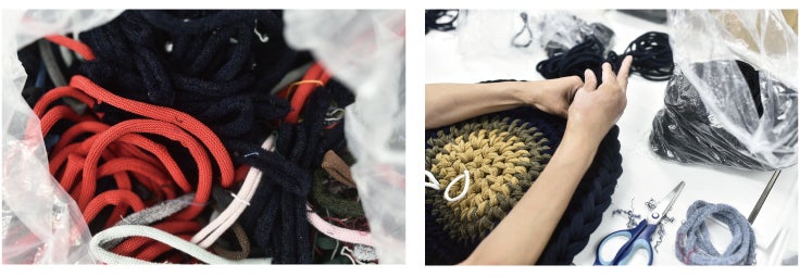 靴下を製造する工程でできるハギレを「作り手の感性や個性」でひとつひとつ丁寧に編み上げて作られています。