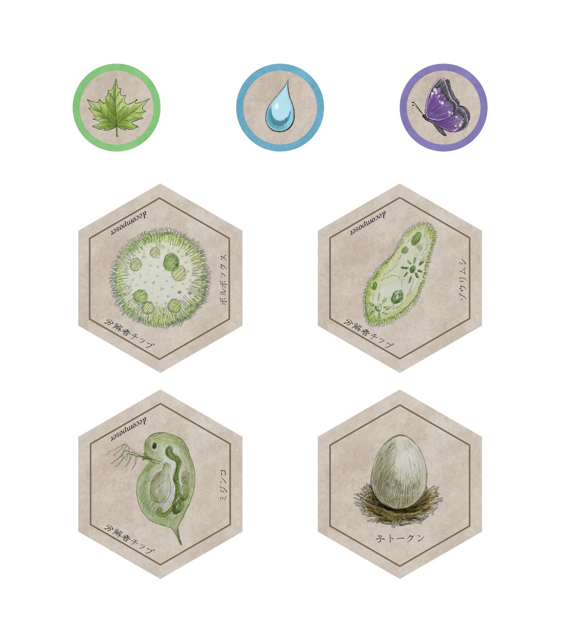 草・水・虫から成るチップを集め、全13種の生物カードを出現させ