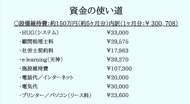 スピカでは、e-Learningなど学習支援の環境整備の為、通常の放課後等デイサービスより経費と維持費が多くかかってしまい、利用者の人数が安定するまで、国保連からの支給だけでは運営が厳しい状況が続いています。