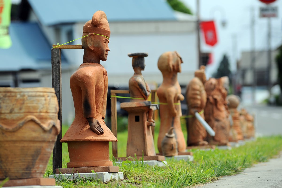 藤沢商店街には、野焼祭で焼き上げた約200個の作品が並べられています。また、110基の街路灯には「炎」の文字が印象的な真っ赤なフラッグが設置されています。「天にフラッグ、地に作品」これが藤沢商店街の特徴です。文化創造活動の拠点「藤沢文化センター」のメインホールはその名も「縄文ホール」。前庭には祭りに感動した洋画家の岡本太郎さんから寄贈されたブロンズ像「縄文人」が設置されています。ほかにも、縄文野焼ミュージアム、街中ギャラリー、さらにはこども園や保育園、小中学校、公共施設、観光施設、自治会館、企業や事業所、主要路線の沿道、自治会コミュニティ花壇、さらには家の庭先にも作品が設置されているなど、藤沢町は町中が美術館です。