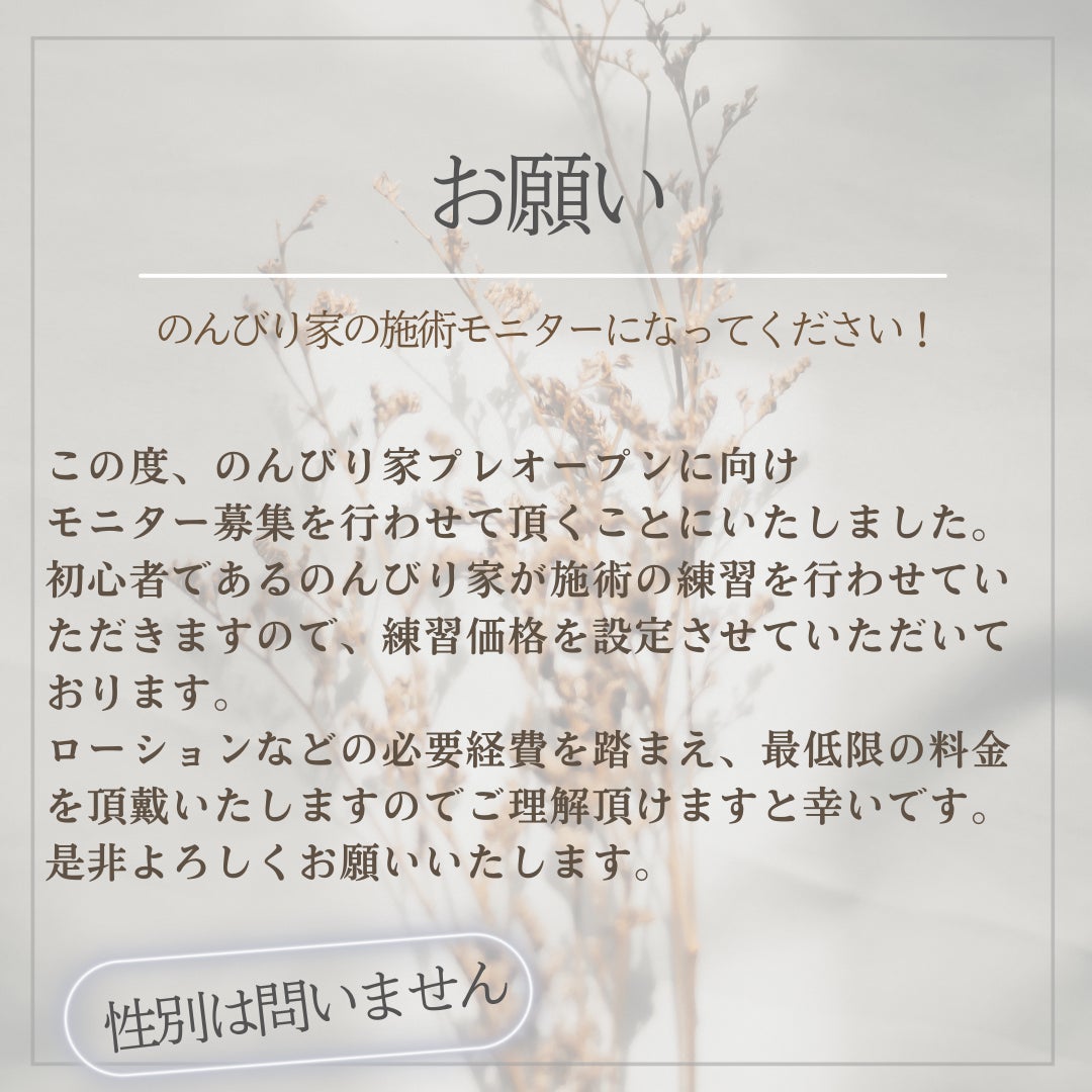 あくまも練習期間である事を、ご理解、ご了承いただけるモニター様を募集します。
