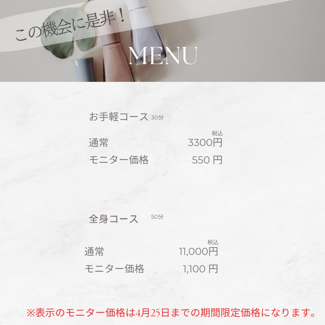 モニター価格の料金期間は、令和6年 4/25日(木)までとさせていただきます。